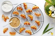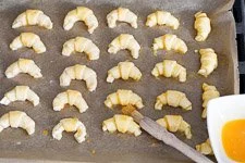 - Bevor die Hörnchen in den Backofen kommen, streichst Du jedes Hörnchen mit Eigelb ein, damit sie eine schöne Farbe bekommen.