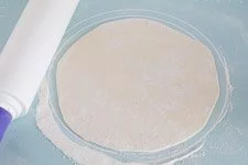 - Jetzt rollst Du mit dem Nudelholz jede Teigportion auf einer bemehlten Arbeitsfläche, von der Mitte aus, ca. 26 cm im Durchmesser aus. Dabei den Teig ab und zu wenden, damit beide Seiten genug Mehl abbekommen und der Teig nicht am Nudelholz klebt.