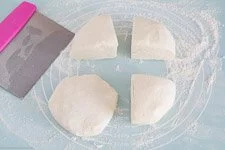 - Den durchgekühlten Teig teilst Du ihn in vier gleich große Teigportionen. Die erste Teigportion knetest Du noch etwas durch. Die restlichen drei Teigportionen gibst Du bis zur Verarbeitung direkt wieder zurück in den Kühlschrank.