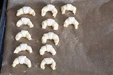 - Die Hörnchen mit etwas Abstand auf ein mit Backpapier ausgelegtes Backblech legen. HINWEIS: Für zwei Teigportionen also 24 Hörnchen benötigst Du ein Backblech.