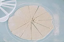 - Dann schneidest Du 12 schmale "Tortenstücke" aus bzw. nimmst einen Tortenstückeinteiler. Drücke ihn fest auf die Teig-Scheibe, damit sich die Stücke abzeichnen. Diese musst Du nur noch "nachschneiden".
