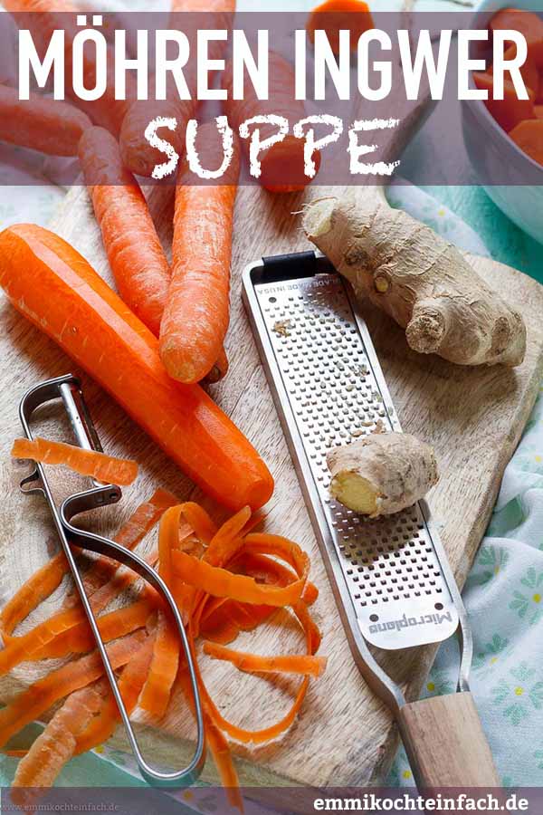 Mein Tipp: Bei Bio-Ingwer kann ich den Ingwer mit Schale fein raspeln, ohne sie vorher entfernen zu müssen. Denn, wie bei so vielen Gemüsesorten, befinden sich die meisten Vitamine und Nährstoffe direkt unter der Schale. Deshalb wasche und trockne ich den Ingwer nur und raspele ihn fürs Möhrensuppe Rezept mit einer Zester-Reibe sehr fein. Solltest Du (noch) keine Zester-Reibe haben, kannst Du auch die feinste Reibe der Turmreibe (Affiliate-Link) nehmen oder die Wurzel mit einem Messer sehr klein schneiden. Tritt beim Reiben Saft aus der Wurzel, gib‘ diesen mit in die Möhrensuppe.