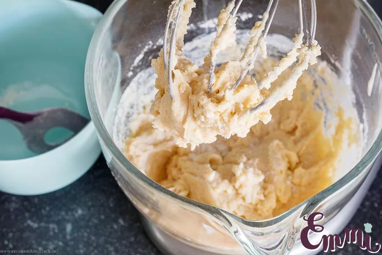 - Dann alle "FEUCHTEN" Zutaten in einer weiteren (Rühr-)Schüssel mit dem Quirl vom Handmixer oder der Küchenmaschine verrühren, bis sich die Zutaten zu einer Masse verbunden haben: 2 Eier, 100 ml Pflanzenöl und 200 g Schmand. HINWEIS: Etwas Zitronensaft, zum Beispiel, würdest du an dieser Stelle mit den feuchten Zutaten verrühren.