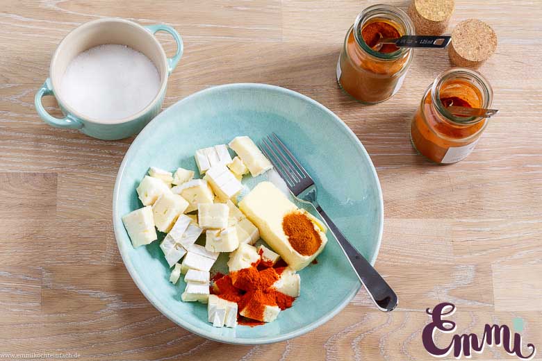 - Die 200 g Camembert / Brie schneidest du mit Rinde in kleine Stücke und gibst sie in einen tiefen Teller, dazu kommen 50 g sehr weiche Butter sowie 1 TL Paprikapulver edelsüß und 1/4 TL Paprika rosenscharf. Mit einer Gabel zerdrückst und vermengst du alles miteinander.