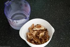 - Dann nimmst Du Dir eine kleine Schüssel, gibst die Steinpilze hinein, übergießt sie mit 200ml heißem Wasser und lässt sie 5 Minuten darin ziehen.