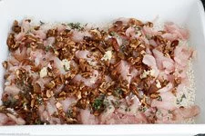 - Nimm Dir eine ofenfeste Auflaufform zur Hand. Meine ist ca. 34 cm x 25 cm. In diese füllst Du den Reis hinein und gibst das klein geschnittene Hähnchenfleisch, die Steinpilze, das aufgefangene Einweichwasser der Steinpilze, den Knoblauch und den Thymian hinzu.
