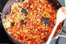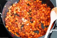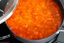 - Jetzt die in Würfel geschnittenen Zwiebeln für einen kurzen Augenblick alleine anschwitzen und dann Möhren, getrocknete Tomaten, Chili und Tomatenmark hineingeben. Das Ganze ungefähr 5 Minuten gemeinsam andünsten.