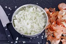 - Die Zwiebeln schälen und in Würfel schneiden. Dabei kommen Dir vielleicht die Tränen bei dieser Menge. TIPP: beim Schälen Wasser in den Mund nehmen, das soll die Tränen vermeiden.