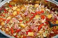 Eine kulinarische Offenbarung darfst Du aber bei der Party Ofensuppe nicht erwarten. Es ist eine leckere, sehr bodenständige Mahlzeit, deren Zutatenkombination einen äußerst deftigen Geschmack zaubern. Ich empfinde sie übrigens eher als Ofensuppen-Eintopf, weil sie mehr dickflüssig als dünnflüssig ist. Unterschätze auch nicht den Einfluss, den Du geschmacklich noch auf sie ausübst. Die Wahl des Fleisches, die Wahl der Zwiebelsorte und nicht zuletzt die Wahl der Fertig-Saucen die Du verwendest.