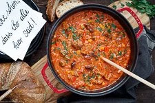 Im Backofen schmoren die Zutaten zu einem herzhaften Eintopf. Selbst das Umrühren erübrigt sich. Du kannst Dich vollständig um andere Dinge kümmern, wie etwa die passenden Beilagen oder andere Party Rezepte.