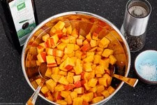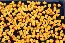 - Die Hokkaido-Stückchen auf ein mit Backpapier ausgelegtem Backblech für ca. 15-20 Minuten auf der mittleren Schiene in den vorgeheizten Ofen geben. Die Backzeit hängt von der Größe der Würfel ab.
