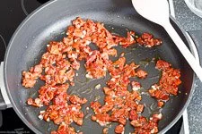 - Jetzt kannst Du das Nudelwasser aufsetzen und die Spaghetti nach Packungsanweisung bissfest garen. BITTE BEACHTE: Die Spaghetti werden tropfnass direkt aus dem Topf in die Pfanne gegeben. Im Zweifel eine Minute kürzer garen, dann kannst Du sie noch ohne weiteres im Wasser "parken" , denn sie garen ja immer etwas nach.