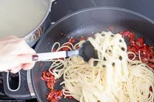 - Die Spaghetti nimmst Du, wenn sie fertig sind, mit einer Nudelzange direkt und tropfnass aus dem Kochwasser und gibst sie in die Pfanne.
