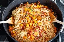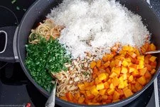 - Die Kürbis-Würfel, die gehackten Walnüsse, den Parmesan und die Petersilie zu den Spaghetti in die Pfanne geben.