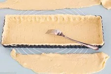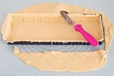 • Als nächstes Teig in Deine gebutterte Form legen, etwas festdrücken und den überstehenden Rand wegschneiden.
