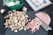 • Die Champignons putzen und in Viertel- oder Achtelstücke schneiden (je nachdem wie groß sie sind). Außerdem schneidest Du den Schinken klein.