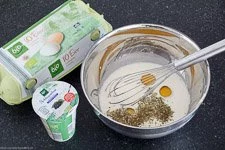 • Dann vermengst Du in einer Schüssel die Sahne mit den 3 Eiern und würzt mit 1/2 TL Salz und 1 TL Oregano (Trockengewürz) und schmeckst nach Wunsch mit Pfeffer ab.