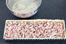 • Jetzt Deine Form mit dem Teig aus dem Kühlschrank nehmen. Die Champignons und den Schinken darauf verteilen und mit der Sahne-Ei-Mischung übergießen.