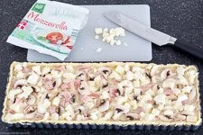 • Dann verteilst Du noch den klein geschnittenen Mozzarella darauf und gibst die Quiche für ca. 35 bis 40 Minuten auf der zweiten Schiene von unten in den vorgeheizten Backofen.
