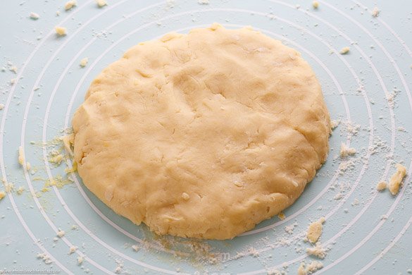 - Wenn der Teig fertig ist, formst Du ihn zu einer flachen Scheibe. Flach hat den Vorteil, dass der Mürbeteig schneller durchkühlt und sich später besser ausrollen lässt. Jetzt wickelst Du den Mürbeteig noch in Frischhaltefolie ein und lässt ihn für ca. 1 Stunde im Kühlschrank ruhen.