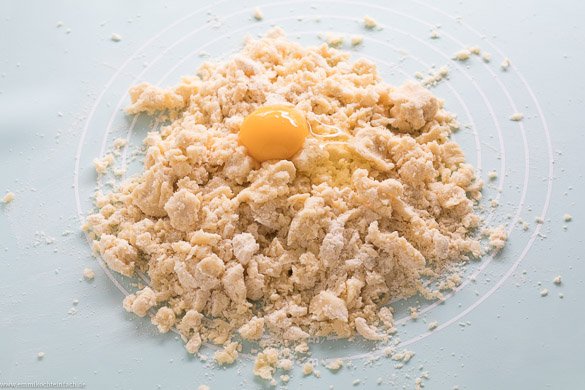 - Wenn die Butter mit dem Mehl gut vermengt ist, und keine nackten Butterklümpchen mehr vorhanden sind (also welche ohne Mehl), gibst Du das 1 Ei zum Teig und knetest es unter bis sich alles schön miteinander verbindet.