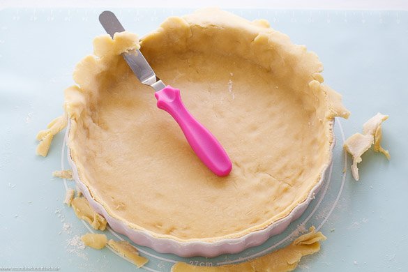 - Den überstehenden Teig legst Du über den Rand und schneidest ihn mit einem Messer oder einer kleinen Winkelpalette ab.