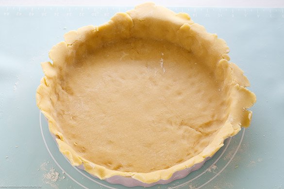- Jetzt den Teigboden mehrmals mit der Gabel einstechen. Somit kann die eingeschlossene Luft unter dem Teig entweichen.