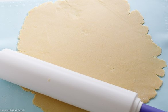 - Du rollst nun den Teig von der Mitte nach außen, etwa 4 mm dünn aus. Den Backofen auf 180 °C Ober-/Unterhitze (160 °C Umluft) vorheizen.