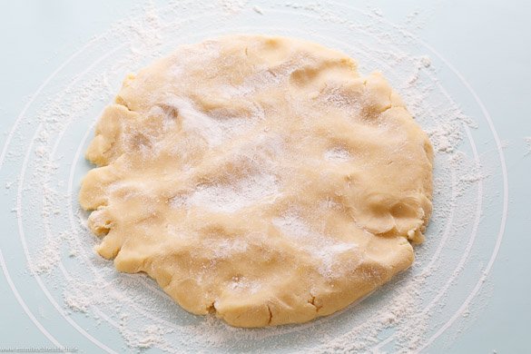 Wenn die Stunde des Ruhens im Kühlschrank vergangen ist, nimmst Du den Teig aus dem Kühlschrank, bestäubst die Arbeitsfläche und auch das Nudelholz von Neuem mit Mehl, damit der Teig nicht daran klebt. Die Oberfläche der Teig-Scheibe drückst Du wieder mit den Handballen weich. So geht das Ausrollen einfacher.