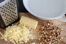- Als erstes heizt Du den Backofen auf 180 Umluft vor und fettest Deine gewählte Form leicht ein, reibst den Emmentaler und hackst die Haselnüsse.