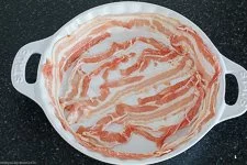 - Deine eingefettete Tarteform legst Du mit den Frühstücksspeck-Scheiben aus.