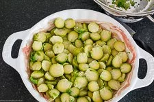 - Nach den 10 Kochminuten den Rosenkohl in einem Sieb abgießen, abtropfen lassen und etwas ausdampfen lassen damit Du ihn gut anfassen kannst. Jetzt halbierst Du den Rosenkohl und schichtest ihn mit der Schnittfläche nach oben in die mit Speck ausgelegte Form.