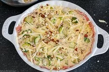 - Während dessen die Füllung vorbereiten indem Du 150 g Sahne, 150 g Schmand, 3 Eier, gehackte Thymianblätter vermengst und kräftig mit Salz, gemahlenem Pfeffer und Muskat würzt. Einen Spritzer Zitrone noch dazu geben.