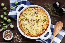 - Die Eier-Sahne-Masse über den Rosenkohl gießen und darauf den geriebenen Emmentaler und die gehackten Haselnüsse verteilen. Im vorgeheizten Backofen auf der mittleren Schiene für 30 Minuten backen.