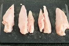 - Das Hähnchenbrustfilet abwaschen, trocknen und in vier bzw. beliebig große Stücke teilen sowie mit Salz und weißem Pfeffer würzen.
