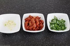 - Die in Öl eingelegten, getrockneten Tomaten aus dem Glas nehmen, etwas abtropfen lassen und würfeln. Die Knoblauchzehe fein hacken. Den Basilikum grob hacken. Alles beiseite stellen.