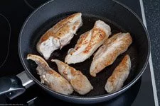 - In einer beschichteten Pfanne 1 EL Öl erhitzen und die Hähnchenbrustfilets von allen Seiten ca. 5 Minuten kräftig anbraten.