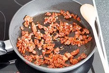 - Die getrockneten Tomatenstückchen und die gehackte Knoblauchzehe in der selben Pfanne auf mittlerer Herdstufe ca. 2 Minuten andünsten. Vorsicht der Knoblauch darf nicht verbrennen sonst wird er bitter.