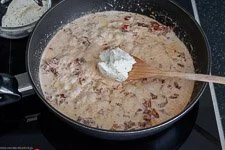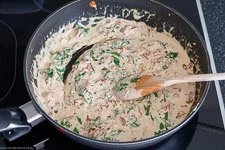 - Dann die Sahne dazu geben, kurz aufkochen lassen und den Kräuterfrischkäse unterrühren und schmelzen lassen.