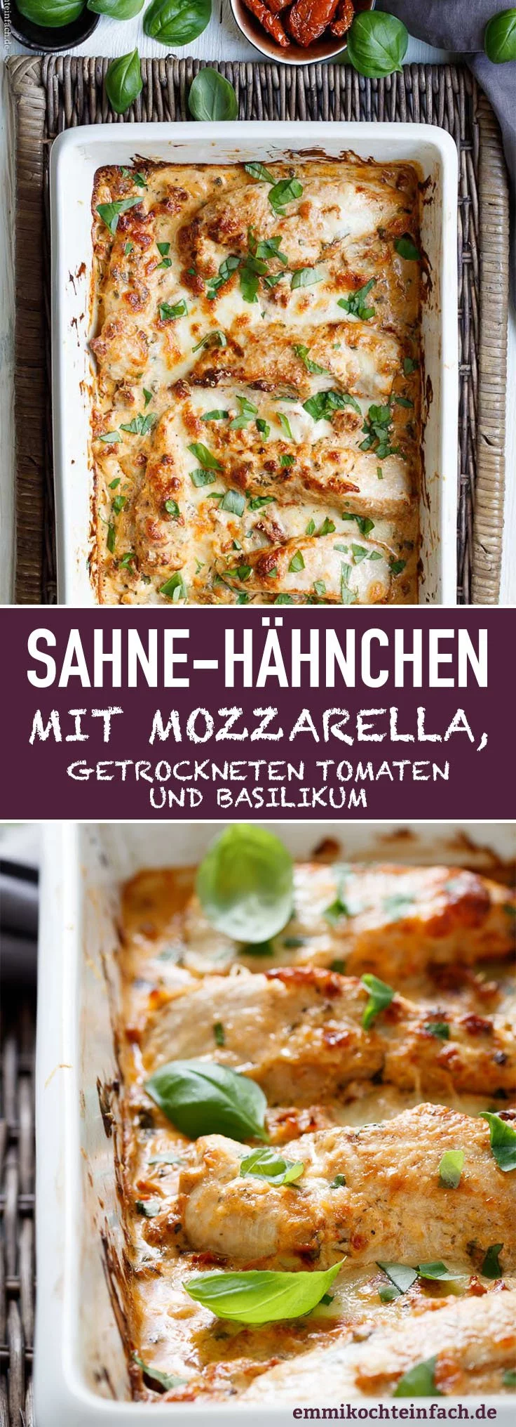 Man hat ja so seine Essphasen im Leben und Dinge auf die man sich eine Weile eingeschossen hat, weil man nicht genug von ihnen bekommen kann. So geht es mir derzeit mit Antipasti-Tomaten, sprich eingelegten getrockneten Tomaten. Ich bin gerade so verrückt nach ihnen, dass ich sie wo es nur passt in meine Rezepte einbaue. So sind sie auch in meinem Sahne-Hähnchen mit Mozzarella gelandet.