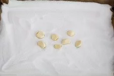 - Jetzt gibst Du ein Backpapier auf ein Backblech, verteilst das Salz darauf und legst die geschälten ganzen Knoblauchzehen mittig, da wo Du den Braten platzieren wirst.