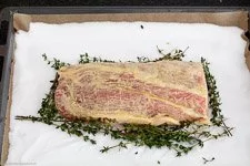 - Dann legst Du den Braten auf die Knoblauchzehen und drapierst Deinen frischen Thymian drumherum.