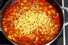 - Den Liter Brühe dazu gießen, die Hörnchennudeln ungekocht unterrühren und alles für 10 Minuten ohne Deckel köcheln lassen. Im Anschluss nach Belieben abschmecken.