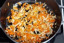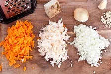 - Als erstes reibst Du die Möhre und den Sellerie auf der groben Seite Deiner Reibe sowie die Zwiebeln und den Knoblauch fein schneiden.