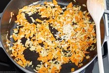 - Im Anschluss 2 EL Olivenöl in Deiner Pfanne auf mittlerer Stufe erhitzen und darin die Zwiebeln, die Möhren und die Sellerie für ca. 5 Minuten andünsten.