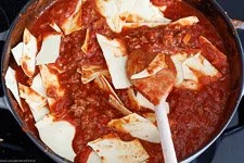 - Jetzt kommen die passierten Tomaten und Tomaten in Stücke sowie die Prise Zucker in die Pfanne und nach Belieben abschmecken. Im Anschluss die in grobe Stücke gebrochenen Lasagneplatten hinein geben und so weit es geht unterrühren bzw. hineindrücken.