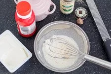 - In der Zwischenzeit die Trick-Béchamelsoße aus Frischkäse und Sahne in einer Schüssel mit einem Schneebesen glatt rühren und mit Salz und Muskat würzen.