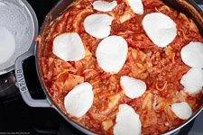 - Nach Ablauf der 15 Minuten die Trick-Béchamelsoße unterrühren, die Mozzarella Scheiben darüber geben und mit Deckel für ca. 5 Minuten schmelzen lassen.