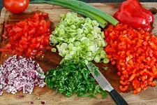 - Während der Bulgur quillt, kümmerst Du Dich um die Schnibbel-Arbeiten: Die 2 Paprika waschen und fein würfeln, Tomaten waschen, entkernen und würfeln, die 3 Frühlingszwiebeln in feine Ringe schneiden sowie die rote Zwiebel fein würfeln und die Petersilie waschen, trocknen und fein hacken.