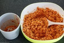 - Zuerst das Dressing gut mit dem Bulgur verrühren (der kann ruhig noch etwas lauwarm sein) und mit Salz, Cayennepfeffer und / oder Pfeffer sowie Zitrone nach Belieben abschmecken.